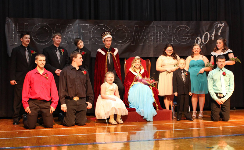 | Homecoming celebrations are underway at Ellsworth School this week. The celebration was kicked off with coronation on Saturday, January 28th where Hannah Kramer was crowned Queen and Jared Leuthold was crowned King. Homecoming Court is pictured back row left to right: Rison Curtis, Trenton Dirks, Bailey Lewis, Jared Leuthold (King), Hannah Kramer (Queen), Samantha Armstrong, Mary Koffron and Hailee Nolte. Front row left to right: Rhett McClain, Ray Auch, Brekkyn Dreesen (Crown carrier), Gabriel Onken (Crown Carrier) and Alex Kramer. |